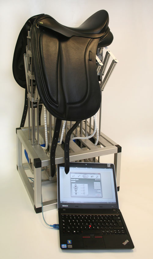 Der patentierte Pferderückenabbilder TOMAX® ermöglicht es, die mittels bundeseinheitlichem Pferderücken-Mess-System ermittelten Daten abzubilden und den zu bearbeitenden Sattel direkt auf dem Gestell anzupassen.